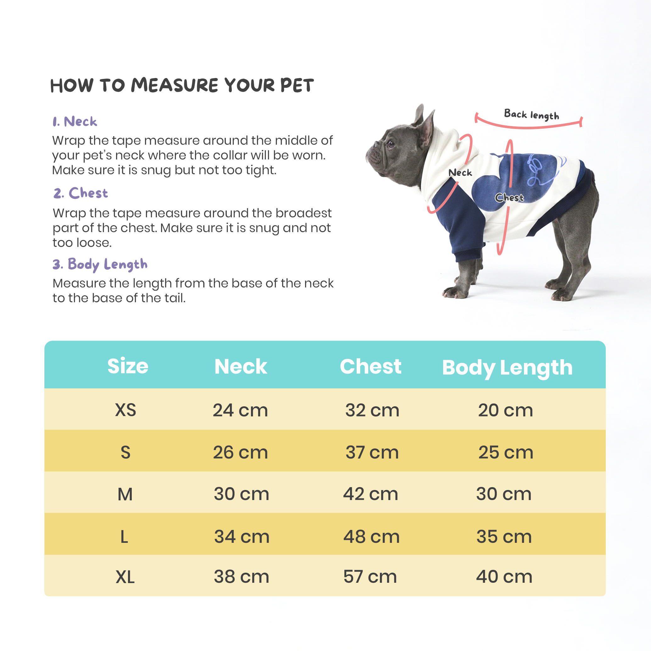 XS: Neck 24 cm, Chest 32 cm, Body Length 20 cm